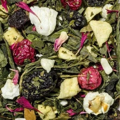 groene thee (46%),druiven, appel stukjes,witte cacaoboter,(suiker cacaoboter,volle melk poeder, dextrose) kersen (8%)zoete zwarte bessen blaadjes, aroma, zwarte bessen, popcorn, korenbloemblaadjes.