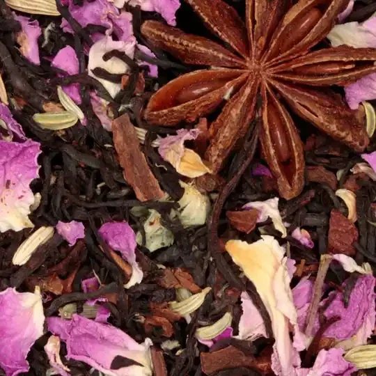 zwarte thee*, kaneel*, rozenbloesem*, steranijs*, venkel*