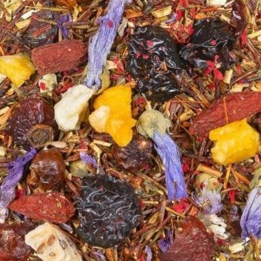 groene rooibos, rozenbottelschillen, aroma, cranberries, goijbessen, duindoornbessen, malvabloesem, stukjes kiwi, granaatappelbloesem, ginsengwortel, stukjes abrikoos