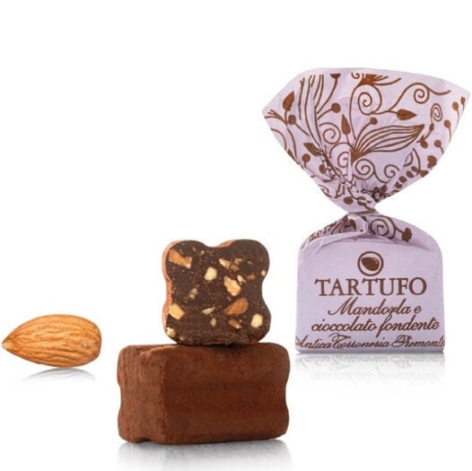 Een onweerstaanbare traktatie uit het hart van Piemonte. Deze verfijnde chocoladetruffel is gemaakt van intense pure chocolade, verrijkt met krokante stukjes amandel voor een subtiel nootachtig accent. De truffel smelt langzaam op de tong, terwijl de amandelstukjes zorgen voor een verrassend knapperige bite.