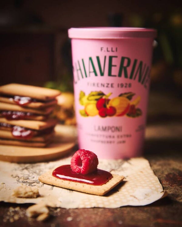 Voeg een vleugje verfijning toe aan je tafel met de ambachtelijke frambozenjam van Chiaverini. Deze jam uit Florence is geliefd om zijn intens rode kleur en de perfecte balans tussen zoet en een licht fris zuurtje. Gemaakt van de fijnste frambozen volgens een authentiek Italiaans familierecept, biedt deze jam een pure fruitbeleving die elke high tea direct een luxueuze uitstraling geeft.