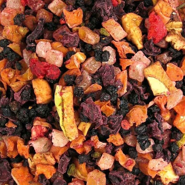 Stukjes wortel, vlierbessen, stukjes appel, rode biet, papaya (papaya, suiker), stukjes ananas (ananas, suiker, citroenzuur), stukjes framboos, aroma.
